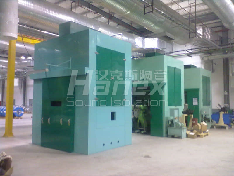 案例簡介:廠區車間內有三臺沖床,用于生產汽車零配件,單臺沖床運作時噪聲值在96dB(A),影響較大。漢克斯隔音對三臺沖床分別增設了隔聲罩后,在隔聲罩1米處量的噪聲值為76dB(A)(單臺)。隔聲罩內設有通風散熱等性能,不影響設備本身使用。